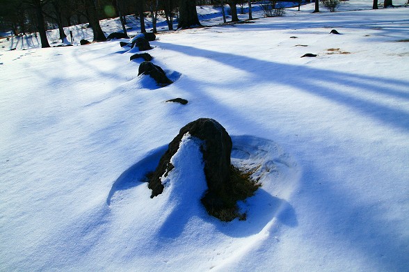 このところ冷え込みは少し和らいでいて積雪も少なくなっています。しかし、ヤチホレイクや 駒出池は全面結氷していてレイクは氷上ドライブも行っています。林の中の 雪面では樹影や雪紋が綺麗です。また、今週中ごろから冷え込みが 強くなるようですから霧氷もチャンスでしょう。 |